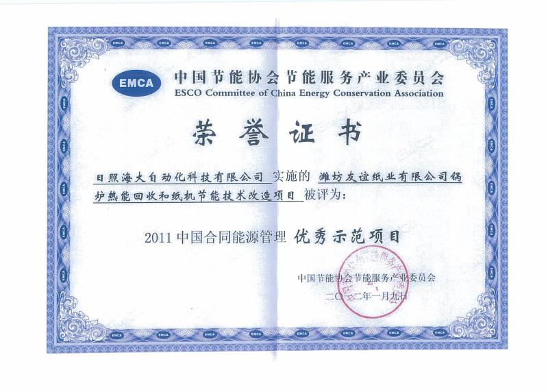 我公司實(shí)施的濰坊友誼紙業(yè)有限公司鍋爐熱能回收和紙機(jī)節(jié)能技術(shù)改造項(xiàng)目被中國節(jié)能協(xié)會節(jié)能服務(wù)產(chǎn)業(yè)委員會評為2011中國合同能源管理優(yōu)秀示范項(xiàng)目。