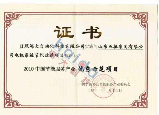 熱烈祝賀 2011年1月我公司負(fù)責(zé)實(shí)施的“山東五征集團(tuán)有限公司風(fēng)機(jī)、水泵、空壓機(jī)系統(tǒng)節(jié)能項(xiàng)目”被中國(guó)標(biāo)準(zhǔn)化研究院、中國(guó)節(jié)能協(xié)會(huì)節(jié)能服務(wù)產(chǎn)業(yè)委員會(huì)評(píng)審為“中國(guó)電機(jī)系統(tǒng)節(jié)能優(yōu)秀項(xiàng)目”。