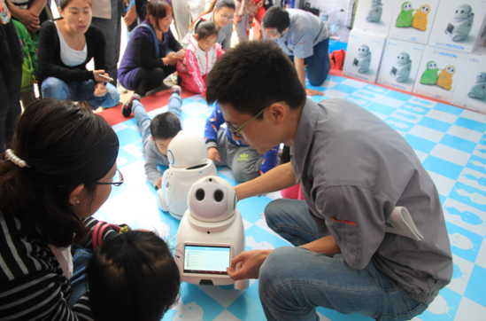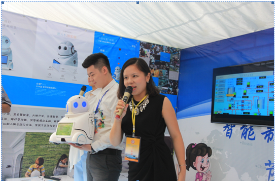我公司員工向參觀觀眾詳細(xì)講解公司的小優(yōu)機(jī)器人的功能特點(diǎn)